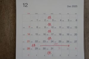 12月のお休みは下記の通りとなります。12月28日(日)が最終営業日となりますのでお気をつけ下さい。